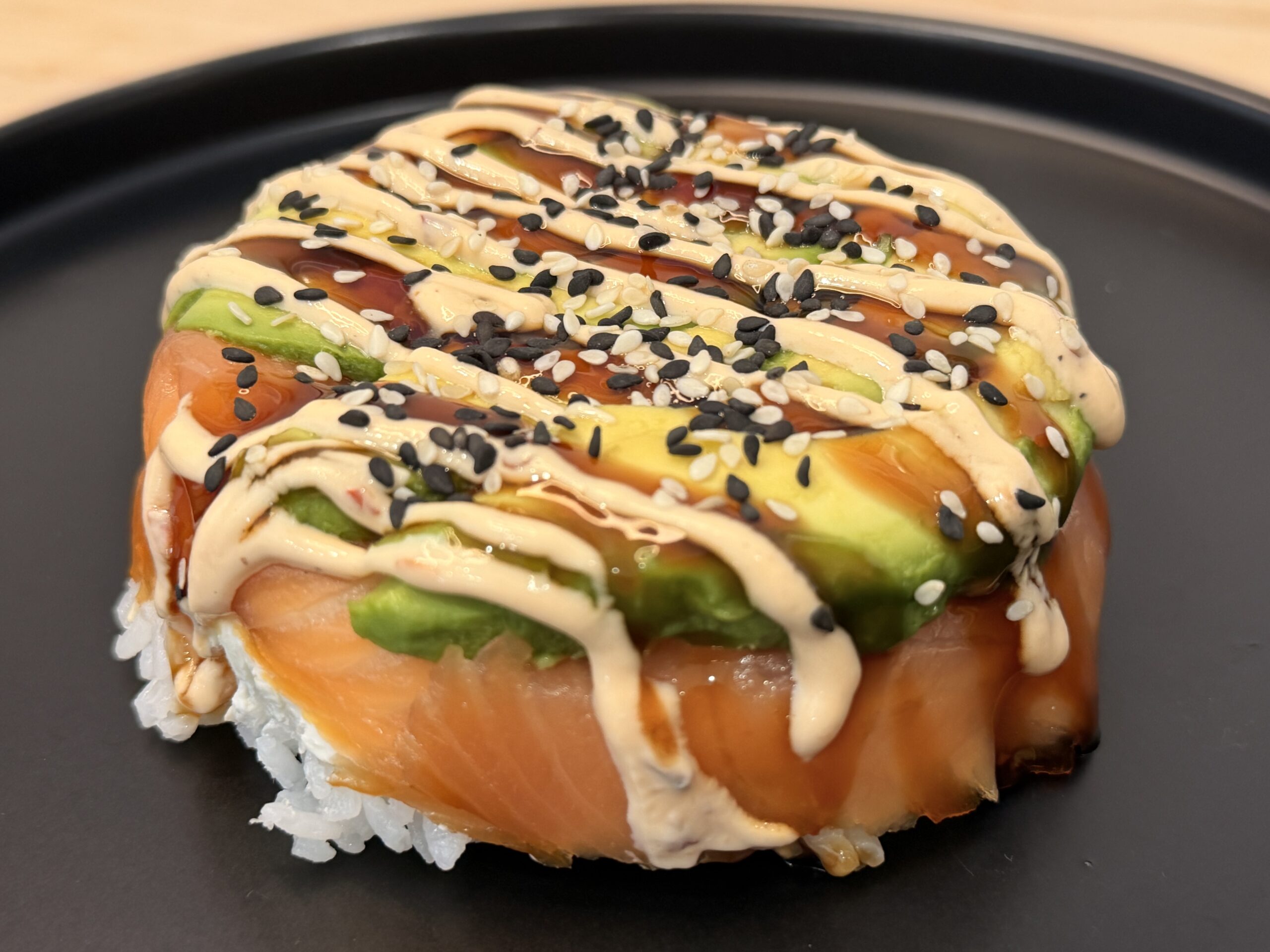 Saumon fumée, crevette tempura, avocat, riz à sushi ( sucre, vinaigre de riz ), Philadelphia, graine de sésame, sauce phili-crémeuse, sauce soya teriyaki.