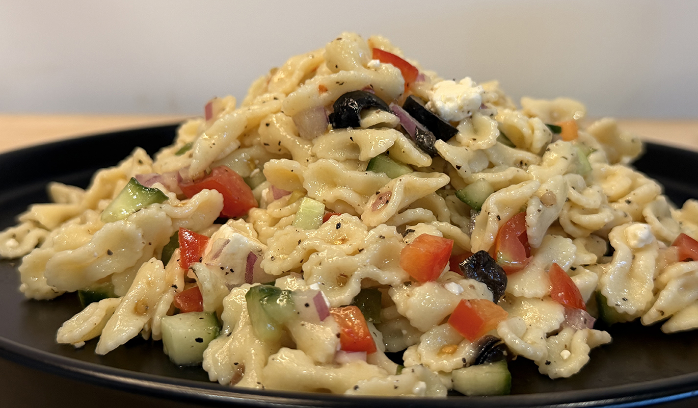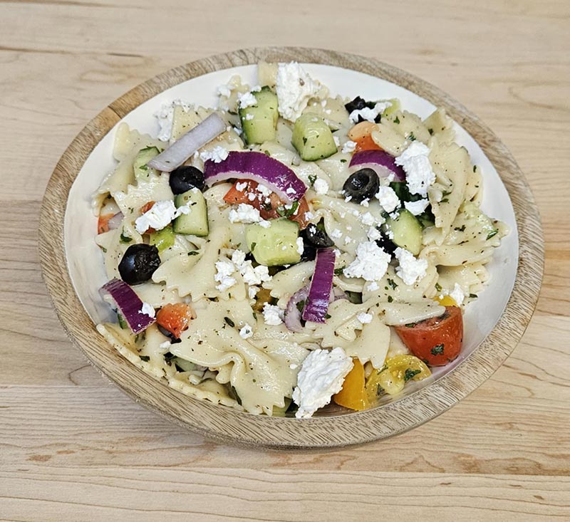 Pâtes alimentaires (semoule de blé dur, niacine, mononitrate de thiamine, riboflavine, acide folique, sulfate ferreux), vinaigrette grecque (huile de soya et huile d’olive extra-vierge, eau, fromage feta, vinaigre, vinaigre de vin rouge, sel, olives noires, poudre d’oignon et d’ail, glucose-fructose, chlorure de potassium, épices, protéine de soya hydrolysée, jus de citron concentré, gomme xanthane, sorbate de potassium, alginate de propylène glycol, arôme naturel, acide lactique, gluconate de fer, EDTA de calcium et de disodium), fromage feta, concombre, oignon rouge, tomates cerises, piment rouge, piment vert, persil, olives Kalamata.