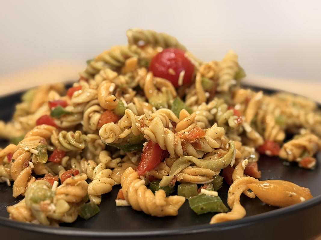 Pâtes alimentaires (poudre de tomate et épinard, semoule, sulfate, mononitrate), piments verts et rouges, échalote, tomate, persil, fromage parmesan, pesto de tomates séchées, huile d’olive.