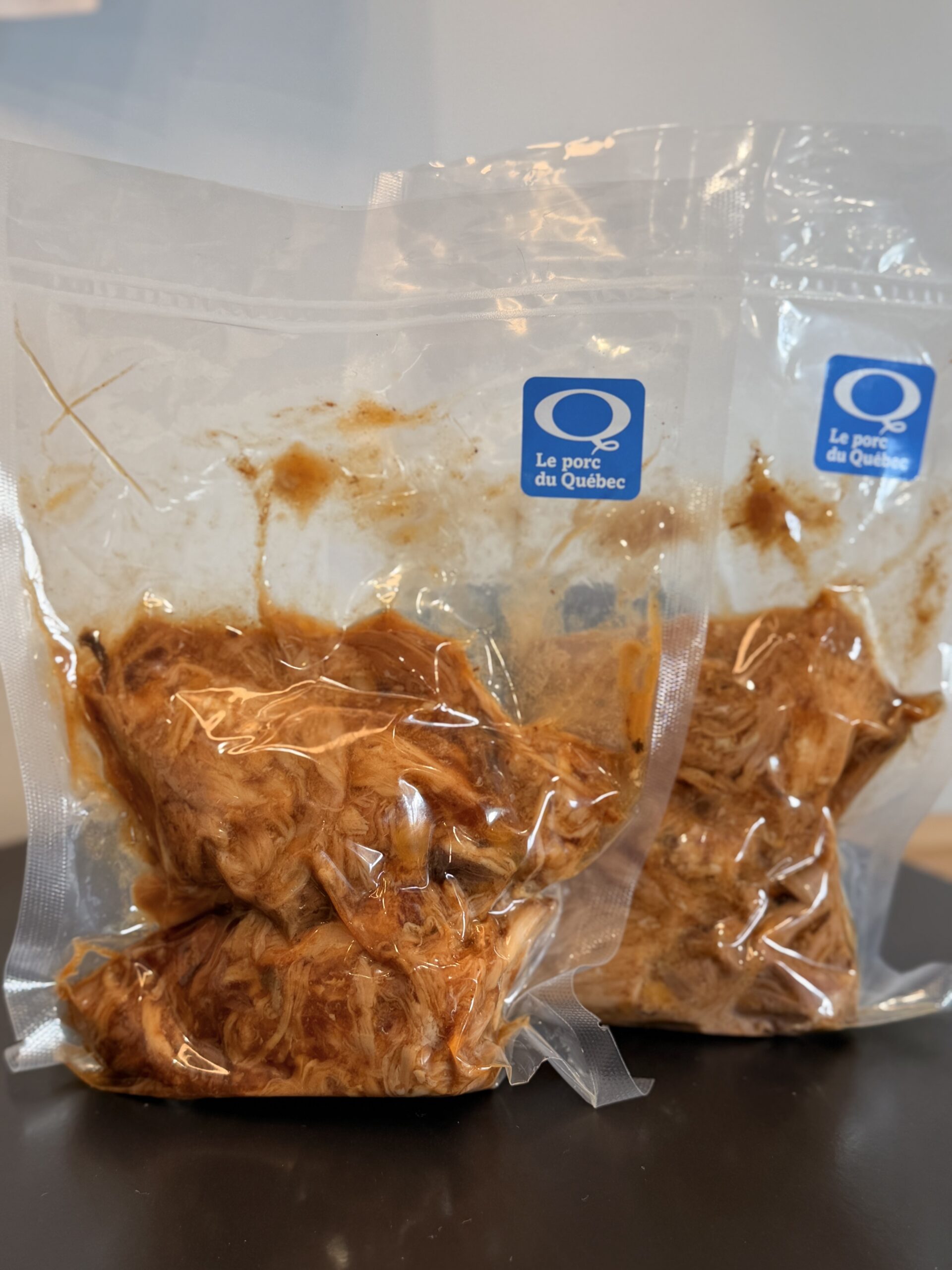 Porc , oignon ,ail , jus de pomme, vinaigre de cidre, cassonade, paprika, cumin, poudre de chili, sel et poivre. Sauce BBQ Memphis ( sucre, eau, pate de tomate, vinaigre, sel, amidon de mais, arome naturel de porc, oignon en poudre, ail en poudre, protéines de soya et blé ).