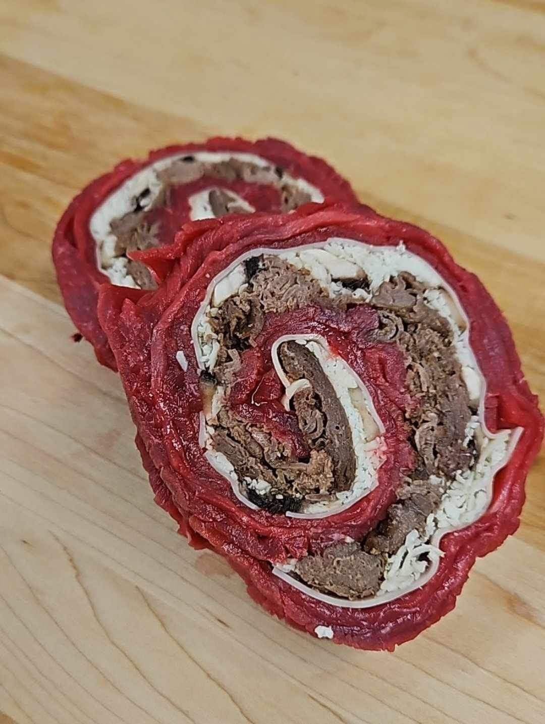 Bœuf attendri mécaniquement, viande à fondue ( cuit dans un bouillon de bœuf et épices à steak de Montréal), champignon. fromage suisse, oignon.