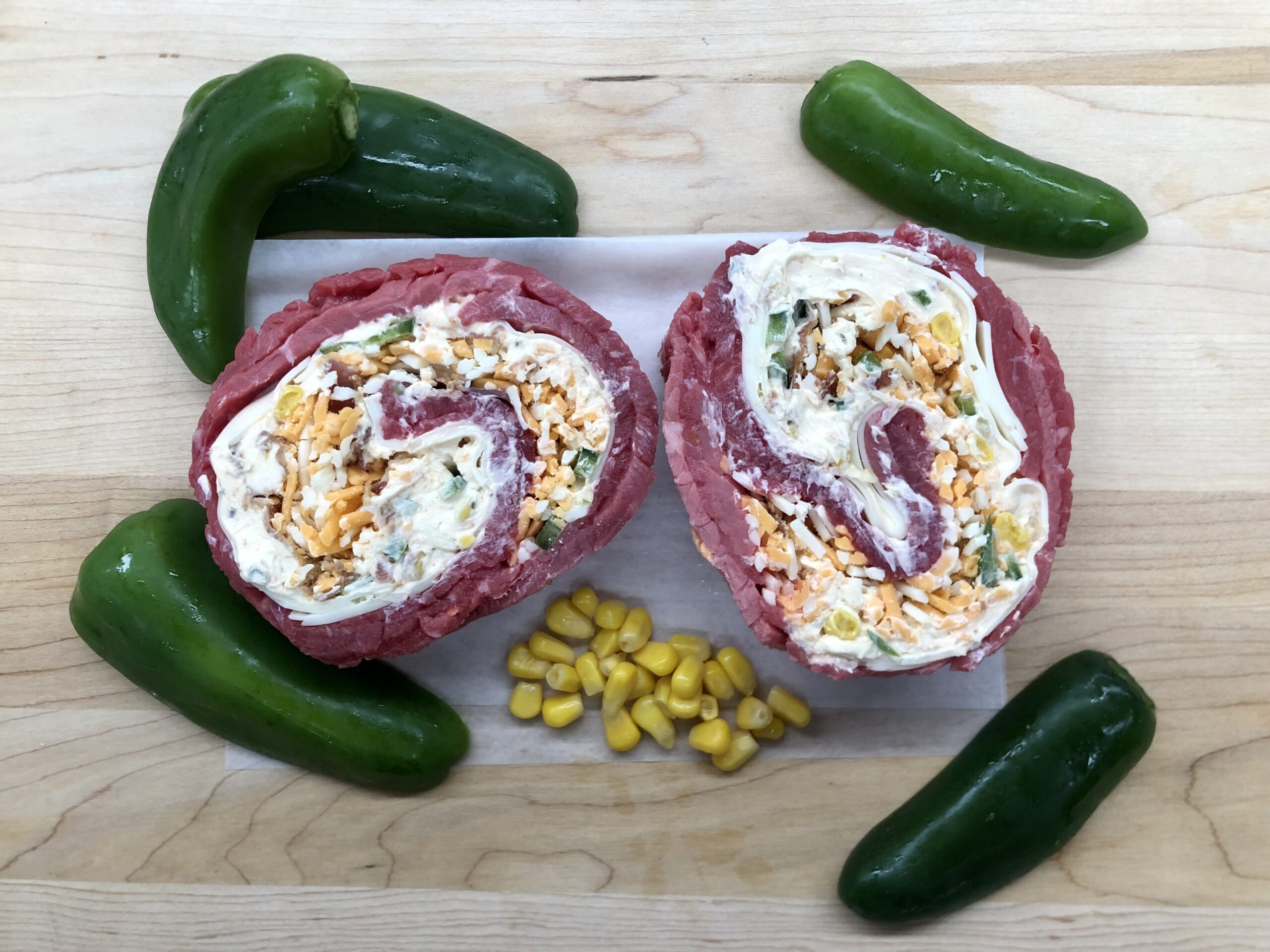 Bœuf attendri mécaniquement, ranchero, Philadelphia, jalapeños, mais en grain, fromage cheddar marbre, bacon.