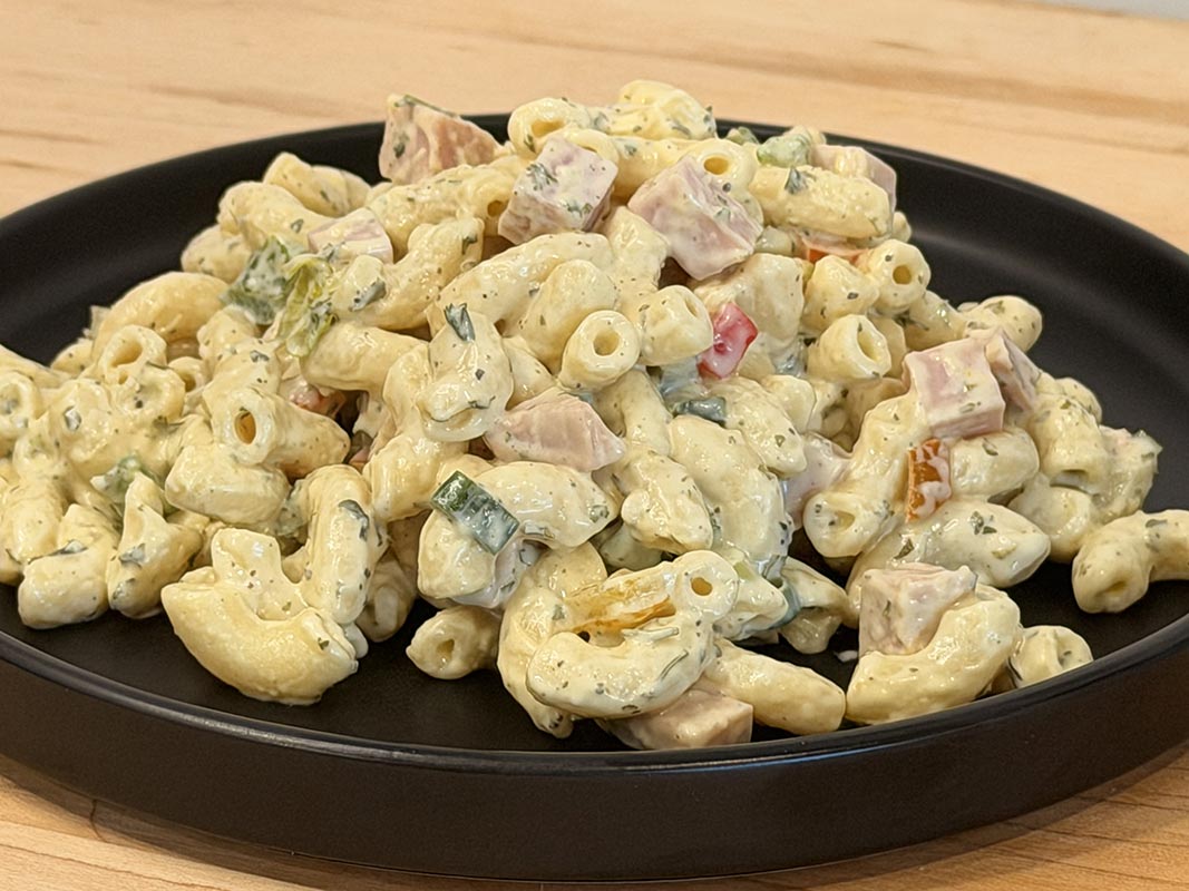 Macaronis (semoule de blé, sulfate ferreux), céleris, piments, échalottes, jambon, mayonnaise (huile de canola, eau, sel, vinaigre, sucre, épices, jus de citron, huile de soja, calcium disodique), base de poulet (sel. dextrose, glucose, shortning, huile végétale, gras de poulet)