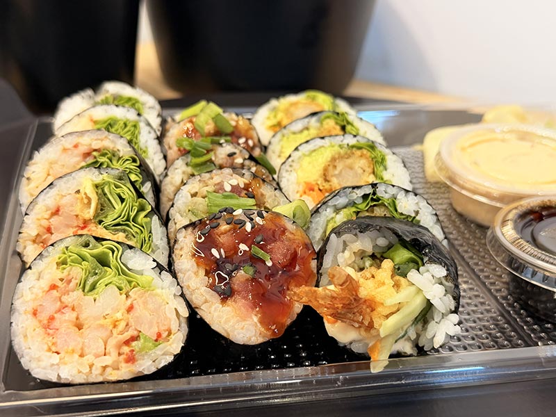 - Crevette tempura, concombre, avocat, laitue, oignon vert, carotte, sauce sésame.