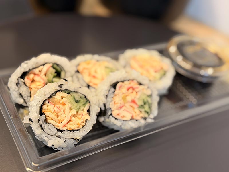 - Crevette tempura, concombre, avocat, laitue, oignon vert, carotte, sauce sésame.